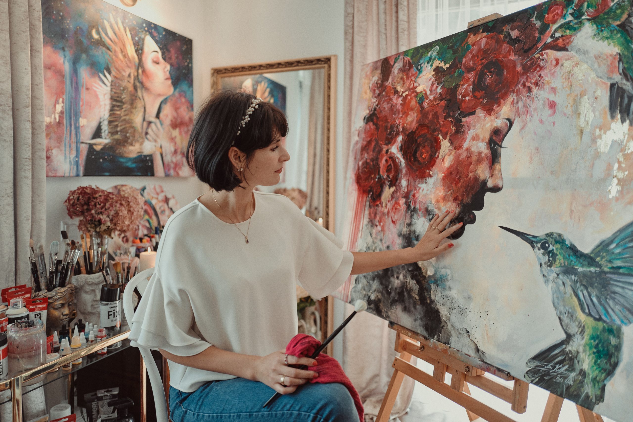 Maluję wyłącznie autorskie obrazy, w których zachowuję swój artystyczny głos. Nie wykonuję portretów. Jednak z przyjemnością stworzę dla ciebie niepowtarzalne dzieło inspirowane twoim światem, ulubionym cytatem, wersetem czy motywem w odpowiadającej wnętrzu stylistyce.